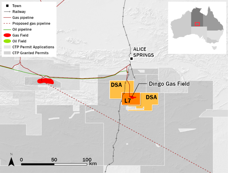 The Dingo Gas Field Development, completed in April 2015, comprised the construction of wellhead facilities, gathering pipelines, compression, a 50 km gas pipeline (Pipeline Licence PL 30) to Brewer Estate in Alice Springs with gas conditioning and custody transfer metering facilities.  It was designed to service a gas sale contract with Territory Generation, now Power and Water Corporation.